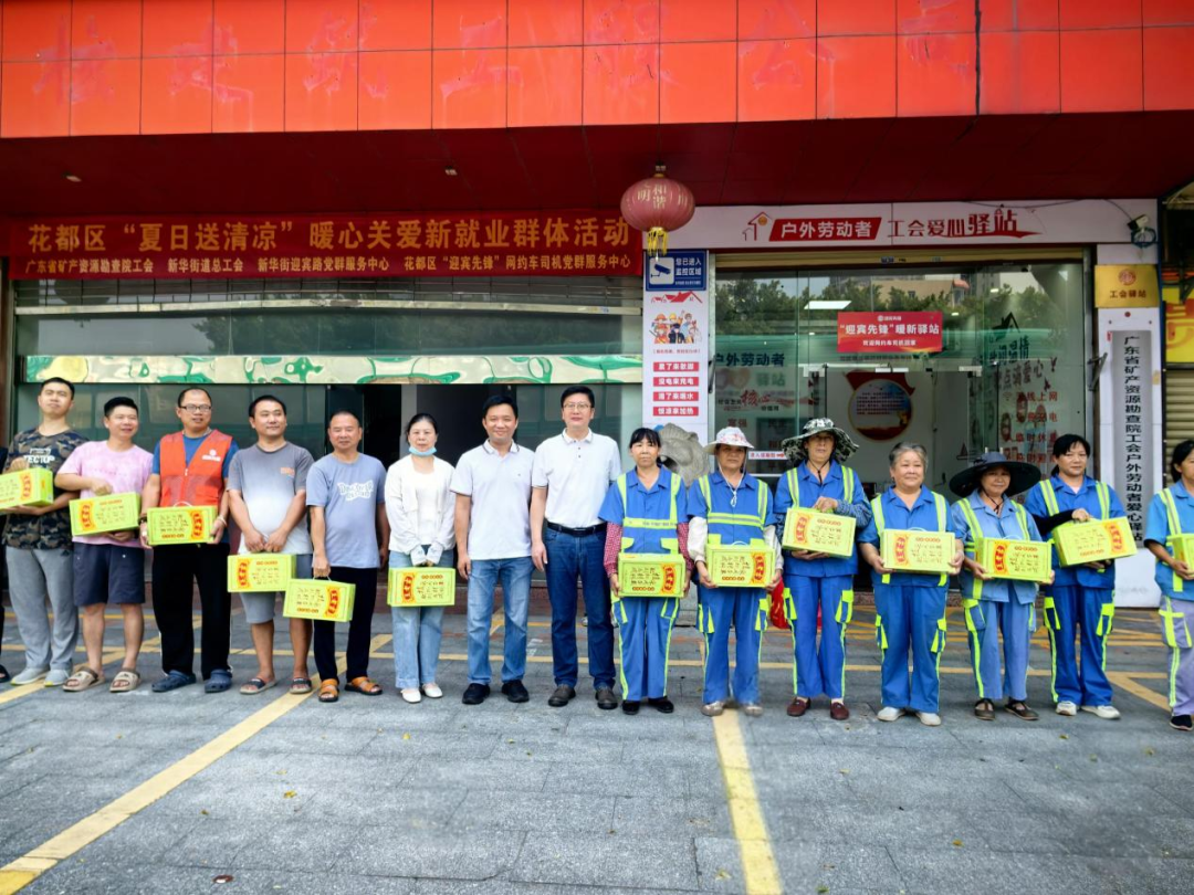 近日,花都区新华街道总工会、新华街迎宾路党群服务中心联合广东省矿产资源勘查院在矿勘院工会户外劳动者爱心驿站中联合开展“夏日送清凉”暖心关爱新就业群体公益活动,为炎热天气中坚守岗位的外卖骑手、快递小哥、环卫工人等户外劳动者送去了一份消暑的清凉与诚挚的关怀。